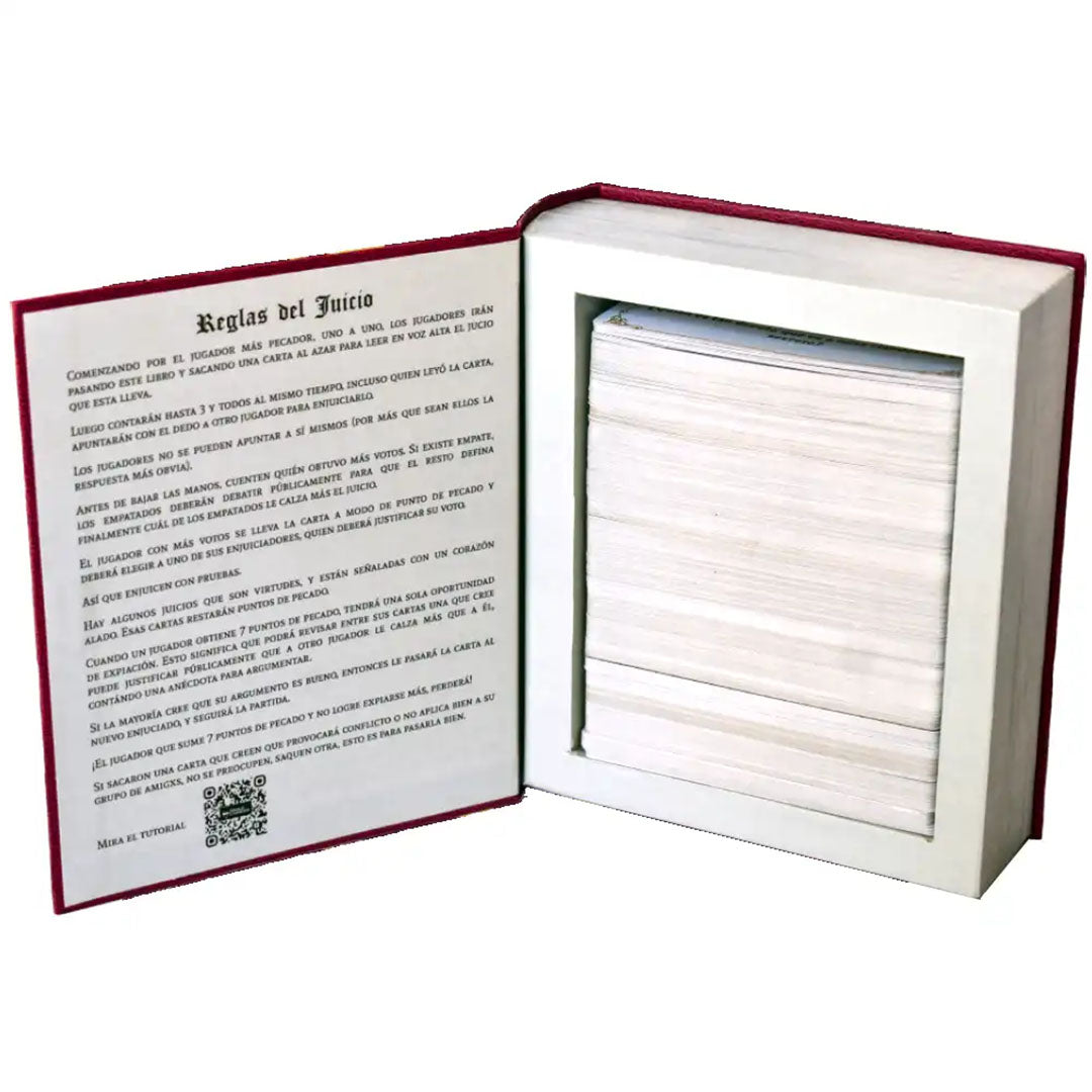 Juicio Final es un juego de cartas diseñado para carretes, ideal para un grupo de amigos que no teman exponer sus vidas en tono de humor. Cada jugador toma turnos leyendo cartas que presentan diferentes escenarios o "juicios", desde actos piadosos hasta pecados hilarantes. Los participantes votan entonces quién entre ellos encaja mejor con la descripción leída. Perfecto para descubrir qué piensan realmente tus amigos sobre ti en un ambiente desenfadado y lleno de risas. Advertencia: este juego incluye contenido que puede ser ofensivo; no es adecuado para quienes se ofenden fácilmente. Prepárate para una noche de diversión irreverente donde todos tus actos, buenos o malos, serán juzgados.